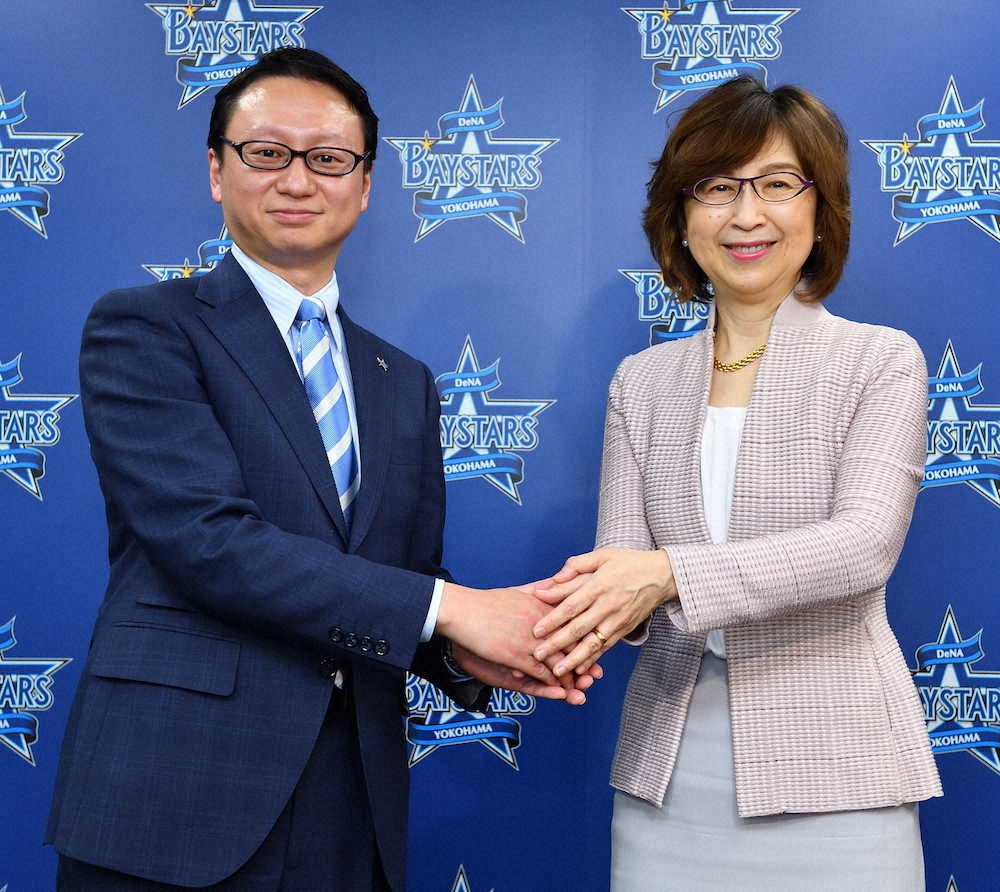 4月からDeNA・新社長に就任する木村洋太氏は南場オーナー(右)とガッチリ握手(球団提供)