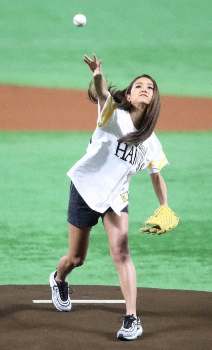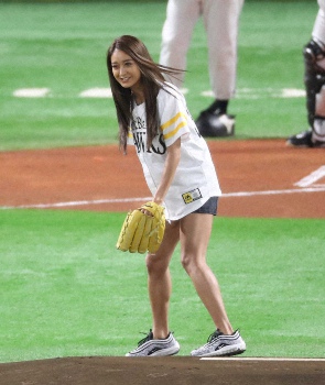 背中に「MICHOPA(みちょぱ)」、背番号「348」のユニホームとホットパンツ姿で登場。1度、深呼吸をし、緊張をほぐした後にワインドアップモーションで右腕を振るとワンバウンドで甲斐のミットに収まり、拍手を浴びた。
