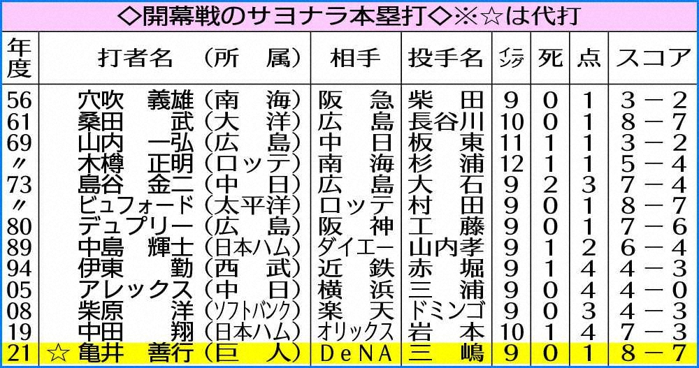 <巨・D>史上初の開幕戦代打サヨナラ弾を放った亀井はガッツポーズ(撮影・森沢裕) Photo by スポニチ 巨人・亀井がプロ野球史上初の開幕戦代打サヨナラ弾! 「今年一番の当たり… ギャラリーで見る この記事のフォト 2021年03月27日の画像一覧 もっと見る 2021年03月27日の画像をもっと見る