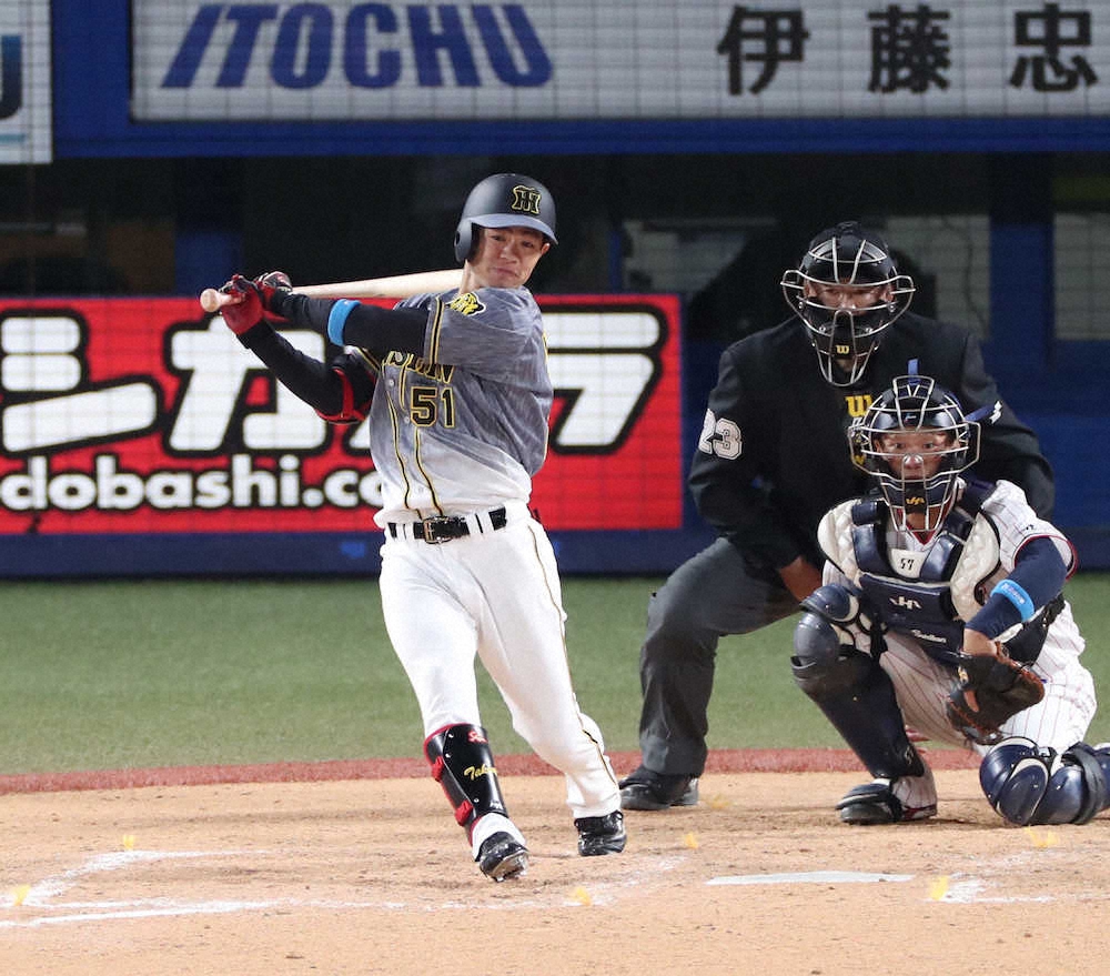開幕前まで話題を独占していた同期入団の佐藤輝より一足先に奏でた快音。社会人出身らしく、物おじしない虎の新背番号51への期待が膨らむ。
