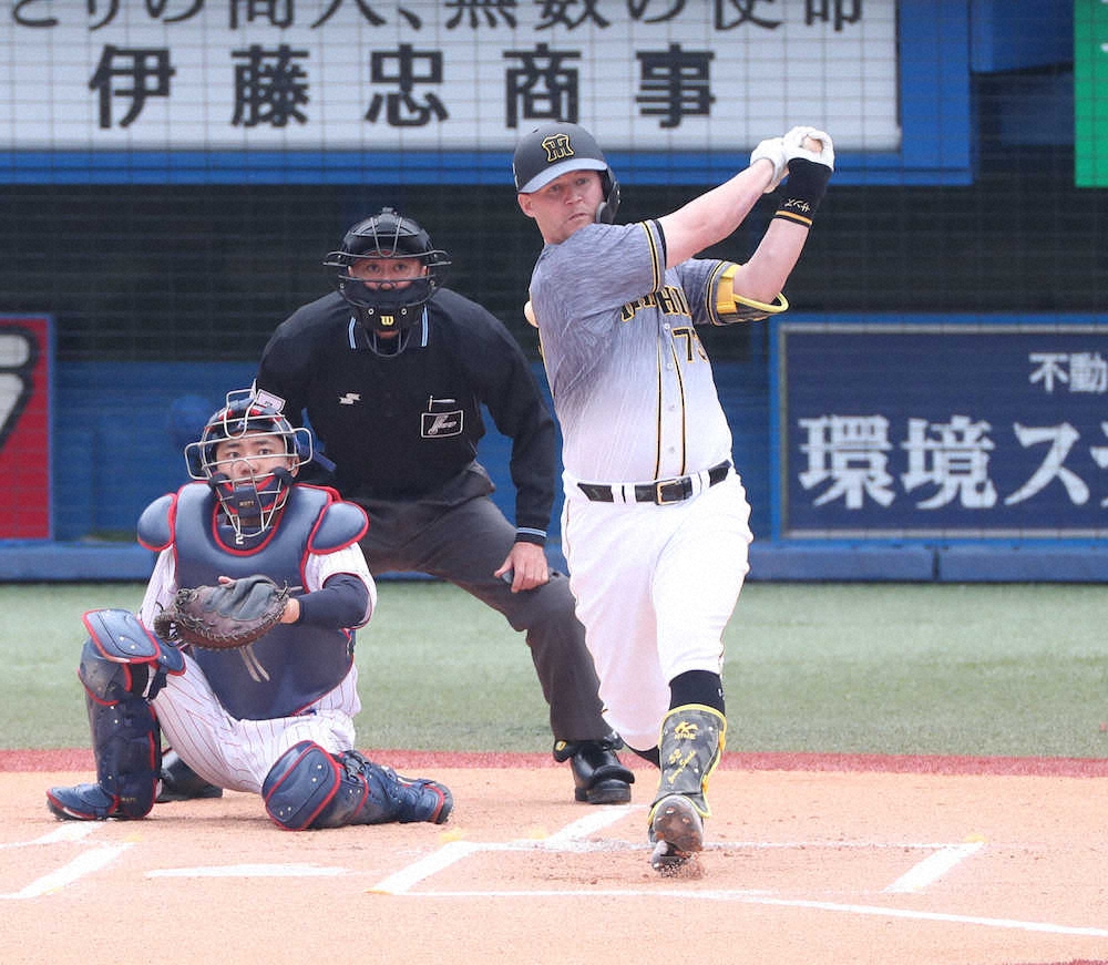 サンズの適時二塁打で、好調の阪神が初回にいきなり先制した。1死から糸原が3戦連続安打となる中前打で出塁すると、続くマルテが四球を選び、一、二塁と好機拡大。大山は三邪飛に倒れたものの、2死一、二塁からサンズが奥川の初球146キロ直球を捉え、左中間を破る適時二塁打。二走・糸原を本塁へ迎え入れ、先制に成功した。