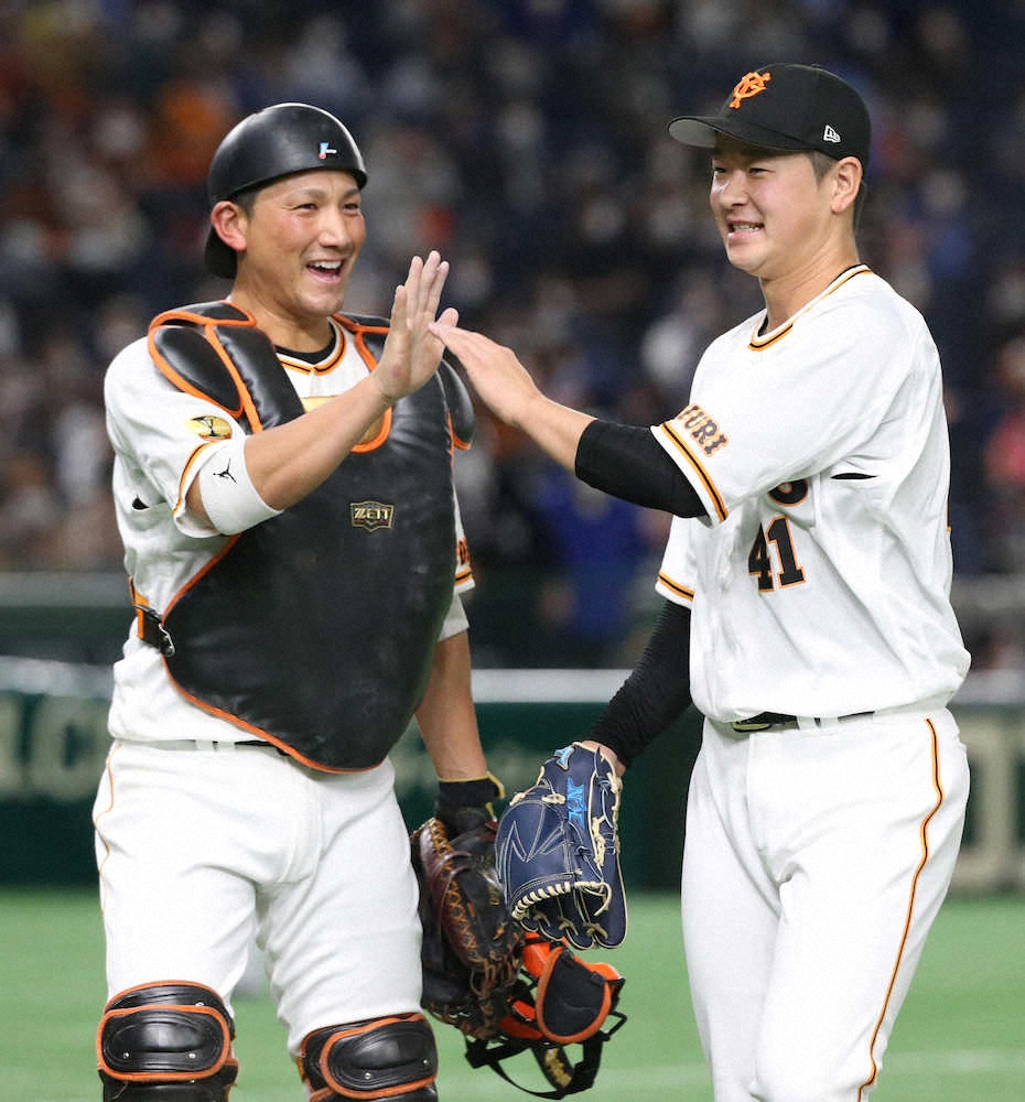 <巨・D>9回2死二塁、嶺井を一邪飛に打ち取り、小林(左)とハイタッチをする中川 (撮影・森沢裕)