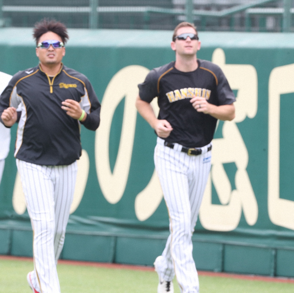 <阪神練習>外野フェンス沿いを走るジョー・ガンケル投手(右)と秋山拓巳投手