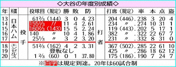 大谷の年度別成績 Photo by スポニチ エンゼルス・大谷 究極の二刀流 ルースもできなかったW規定到達へ 今季… ギャラリーで見る この記事のフォト 2021年03月30日の画像一覧 もっと見る 2021年03月30日の画像をもっと見る