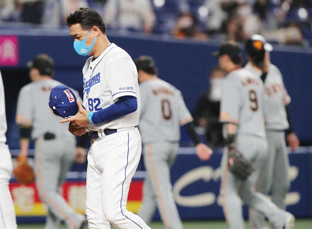 <中・巨>巨人に敗れ、うつむきながら引き揚げる中日・与田監督(撮影・椎名 航)