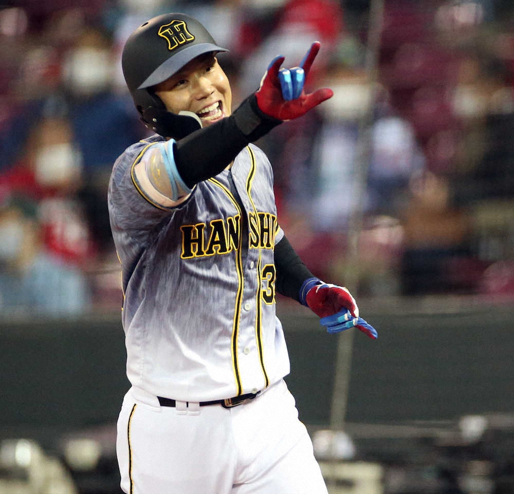 ダメージを与えることに成功した。近本の遊ゴロが失策となって、つかんだ好機。勝負どころを逃すまいと、フルカウントからの7球目スライダーを一閃(いっせん)した。ベンチ前では糸井から伝授されたというポーズで、ナインと喜びを共有。先制点を呼び込んだ初回の左越え三塁打に続き、序盤の猛攻につなげた。