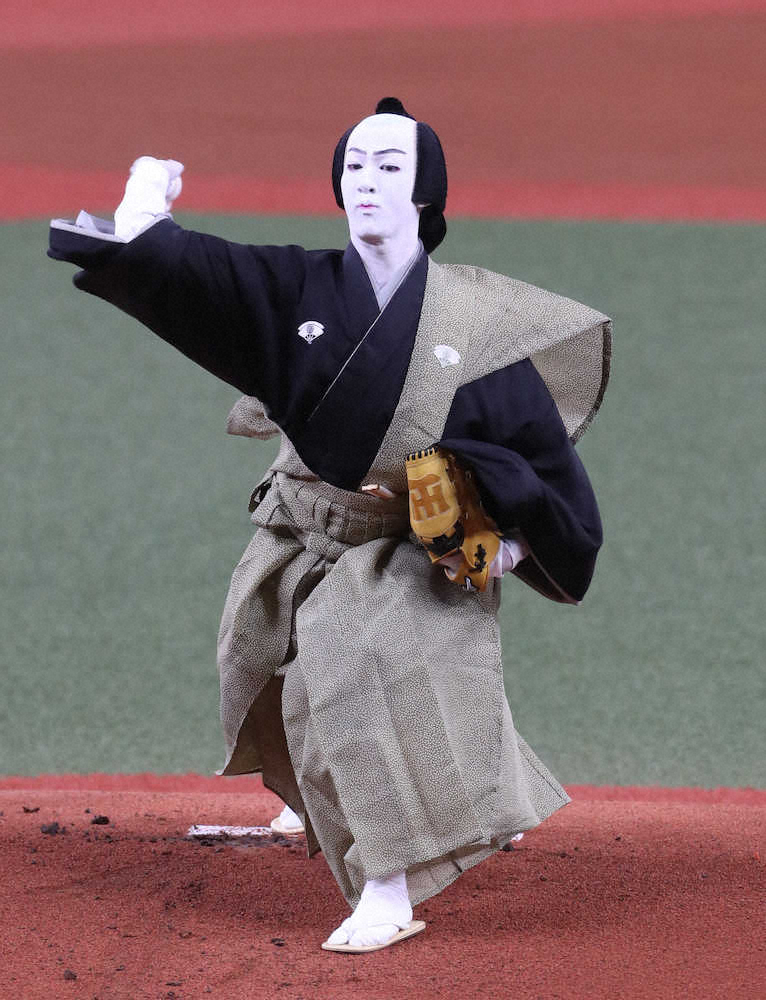 <神・中>始球式をつとめた尾上右近(撮影・大森 寛明)