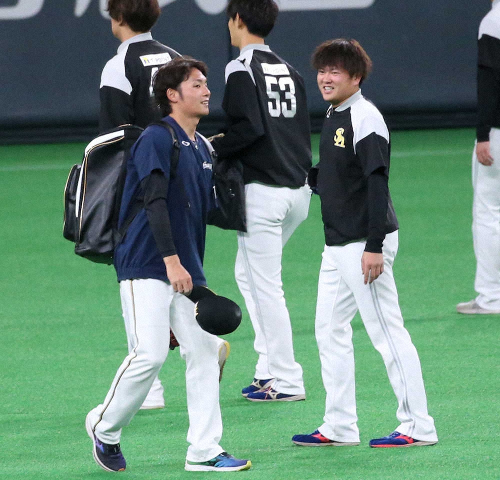 <日・ソ>試合前の練習終了後にソフトバンク・津森と話す日本ハム・伊藤(左)(撮影・高橋 茂夫)