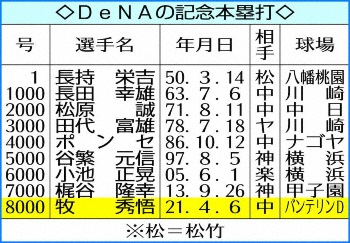 ▽新人・牧の今季2号がDeNA通算8000本目の本塁打となった。通算8000号は巨人の1万484本を筆頭に10球団目。球団の第1号は大洋時代の50年3月14日松竹戦の長持栄吉で、最多本塁打は松原誠の330本となっている。新人が1000本単位の記念弾を記録したのは球団では初めてだ。