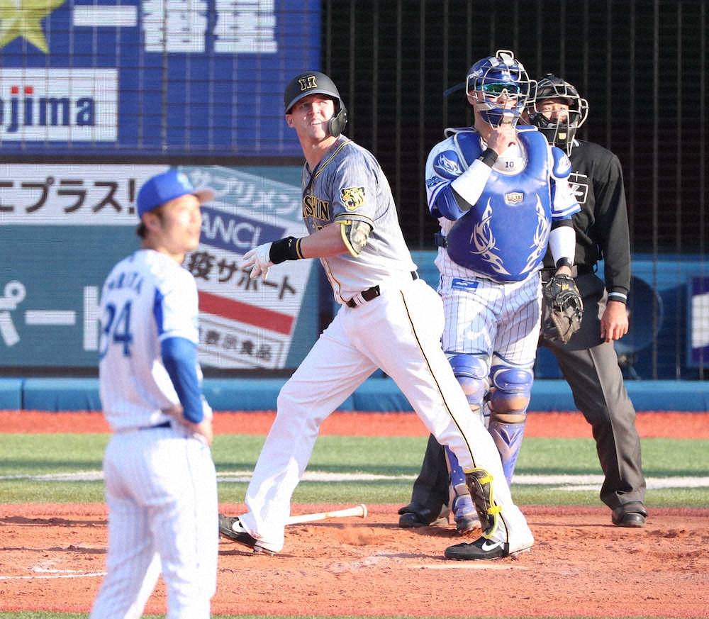 昨夜、佐藤輝が放った場外弾に対抗!?しつつ、ダメ押しの一発に頬を緩めた。7日の巨人戦以来、3試合ぶりの5号2ラン。矢野監督も「もう1点ほしいというところで2点は大きかった」と、その活躍に目を細めた。昨季、横浜スタジアムでの球場別成績は打率・385、4本塁打、14打点。その好相性ぶりは、今季も健在だ。