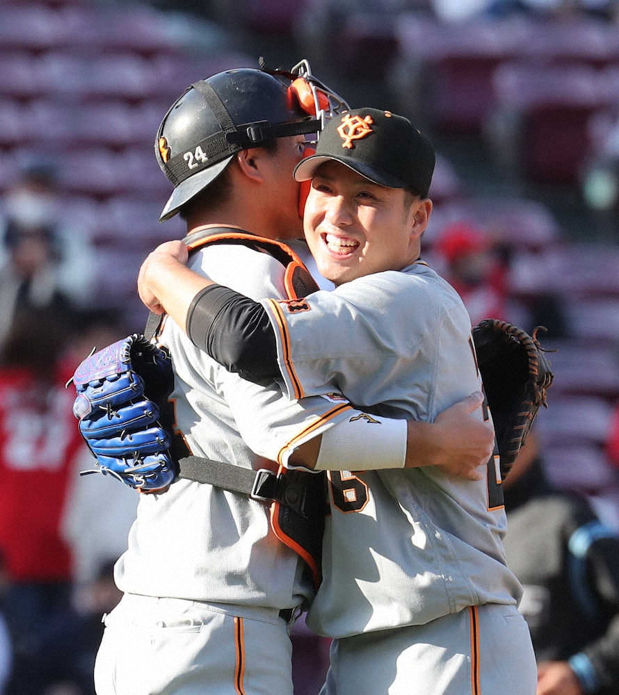 <広・巨>7安打完封で2勝目を挙げた今村は大城(左)と抱擁(撮影・成瀬 徹)