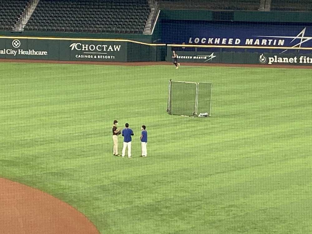 レンジャーズの有原が本拠地でのパドレス戦前にグラウンドでダルビッシュとあいさつを交わした。古巣・日本ハムだけでなくチームの先輩にもあたり10分間ほど談笑。