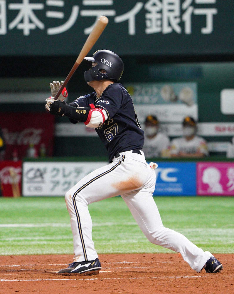 <ソ・オ>9回1死満塁から中越え2点適時二塁打を放ち、開幕から続いた連続1桁安打試合を止めたオリックス・中川圭(撮影・岡田 丈靖)