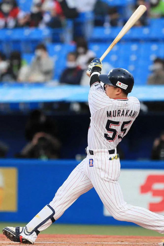 ヤクルト・村上がリーグ単独トップを快走する7号ソロ。初回2死、フルカウントから「うまくバットに乗ってくれた」と低めチェンジアップをすくい上げてライナーで右翼席最前列へ運んだ。