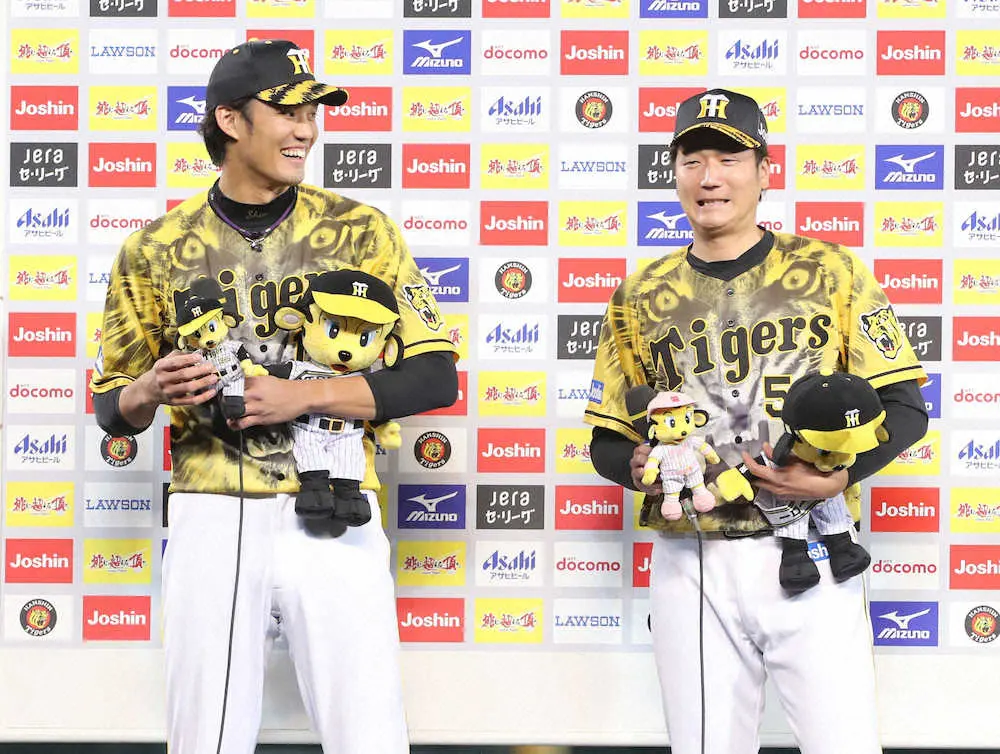 <神・ヤ> 笑顔でヒーローインタビューを受ける阪神・藤浪(左)と小林(撮影・大森 寛明)