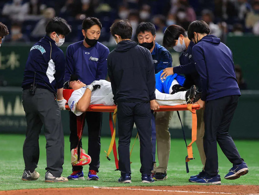 日本ハム・樋口が左膝に死球受け、担架で退場