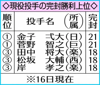 ≪沢村栄治超え≫菅野(巨)が完封で今季初勝利。完封勝利は通算21度目で金子(日)に並ぶ現役最多となった。また、巨人の通算最多完封はスタルヒンの62度だが、菅野は沢村栄治の20度を抜き、桑田真澄に並ぶ12位タイに浮上した。