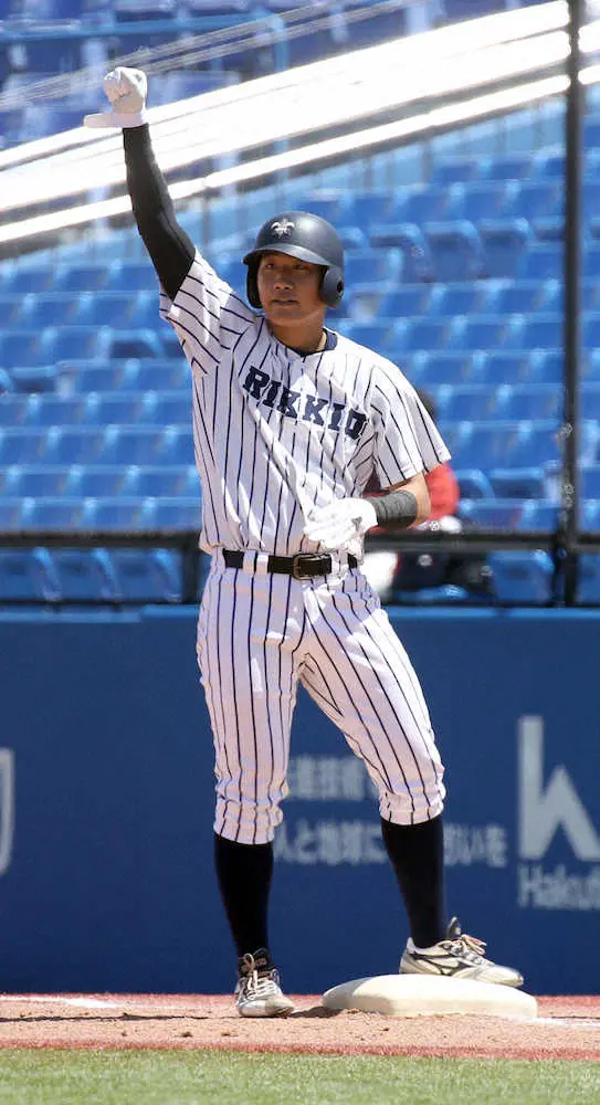 <立大・法大>3回2死二、三塁 先制の2点適時打を放ち塁上で、ガッツポーズする立大・東(撮影・久冨木 修)