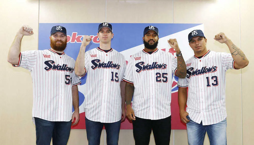 ヤクルトのリック・バンデンハーク投手(35)、サイスニード投手(28)、ホセ・オスナ内野手(28)、ドミンゴ・サンタナ外野手(28)が19日、都内の球団事務所で会見した。