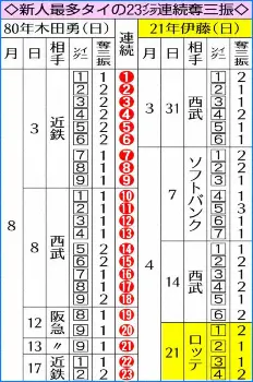 と伊藤は歴代5位タイで、80年木田に並ぶ新人の最多タイ記録になった。また、デビューイニングからの23イニング以上連続奪三振は史上初だ。