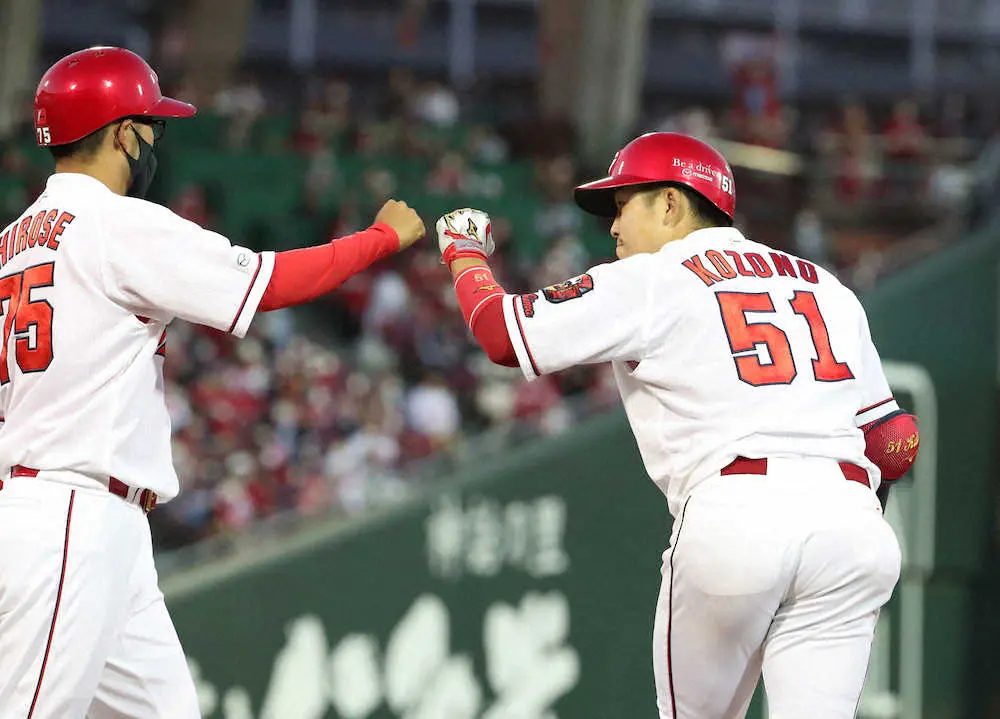 <広・ヤ(6)>2回2死一、二塁、右前に適時打を放った小園は広瀬コーチ(左)とタッチを交わす (撮影・奥 調)