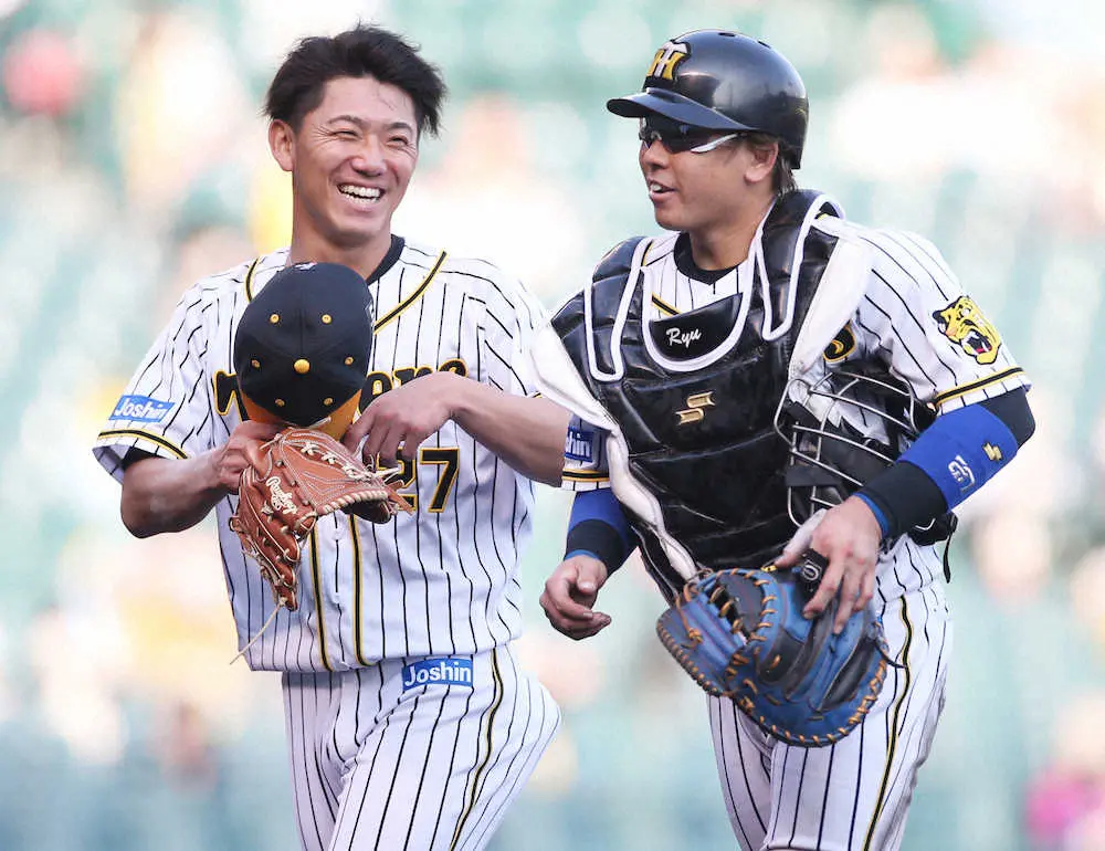 <神・D>1失点でプロ初完投勝利を挙げ、梅野(右)と笑顔で言葉をかわす伊藤将(撮影・北條 貴史)