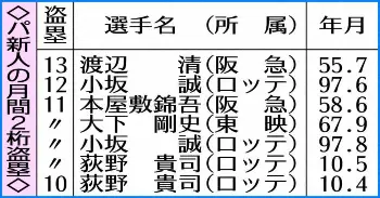若林は今月だけで7盗塁。月間7盗塁は5盗塁の源田を抑えてリーグ1位だ。西武の月間最多盗塁は秋山幸二(90年5月)、松井稼頭央(97年5月)、片岡易之(09年9月)、金子侑司(16年8月)の14盗塁となっている。新人では81年9月の石毛宏典と17年5、7月の源田の8盗塁が最高で、今月まだ4試合を残す若林が記録を更新する可能性は大いにある。さらに新人で月間2桁盗塁となれば球団初、リーグ全体でも10年5月の荻野(ロ)以来11年ぶり6人目、8度目。開幕直後の4月では前記の荻野しかマークしていない。