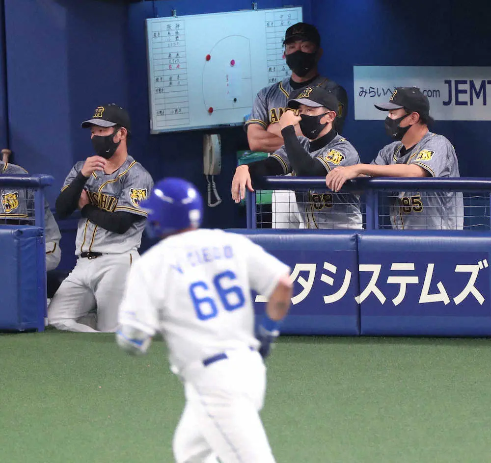 <中・神(5)>8回2死一、二塁、ビシエドに右越え3ランを打たれ、渋い表情の矢野監督(右から2人目)ら(撮影・坂田 高浩)