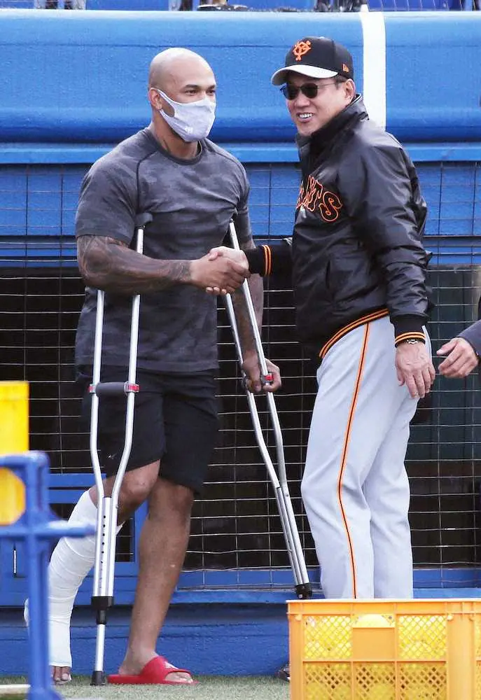 <ヤ・巨>松葉づえ姿で球場に現れたテームズ(左)と笑顔で握手する原監督(撮影・村上 大輔)