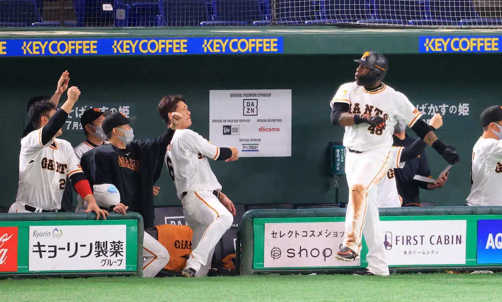 <巨・中(8)>7回2死一塁、2ランを放ちベンチの坂本らとパフォーマンスするウィーラー(撮影・白鳥 佳樹)