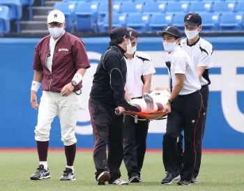 早大・蛭間拓哉外野手(3年)が法大2回戦の7回に左膝を痛め、途中交代。タンカでベンチ裏に運ばれ、救急車で搬送された。