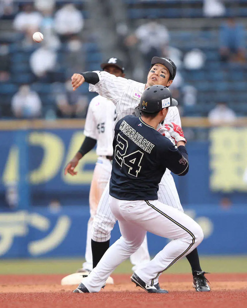 <ロ・オ>9回1死一、二塁、頓宮の打球は二ゴロ併殺かと思われたが、一塁走者・紅林と衝突した中村奨は一塁に送球できず(撮影・西川祐介)
