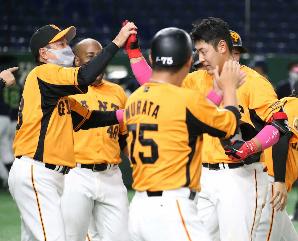 <巨・ヤ7>原監督とハイタッチを交わす岡本和(撮影・森沢裕)