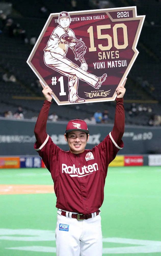 プロ初セーブを挙げた札幌ドームで、金字塔を打ち立てた。楽天の守護神・松井が9回を3者凡退。通算150セーブを達成した。25歳6カ月での達成は、DeNA・山崎(26歳9カ月)を抜く史上最年少だった。