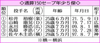 ≪通算364試合目は歴代8番目≫松井(楽)が今季9セーブ目を挙げ、通算150セーブを達成した。岩瀬仁紀(中)の407セーブを筆頭にプロ野球16人目。初セーブは15年3月28日の日本ハム戦。25歳6カ月での到達は山崎(D)の26歳9カ月を抜き最年少で、通算364試合目は歴代8番目のスピードとなった。