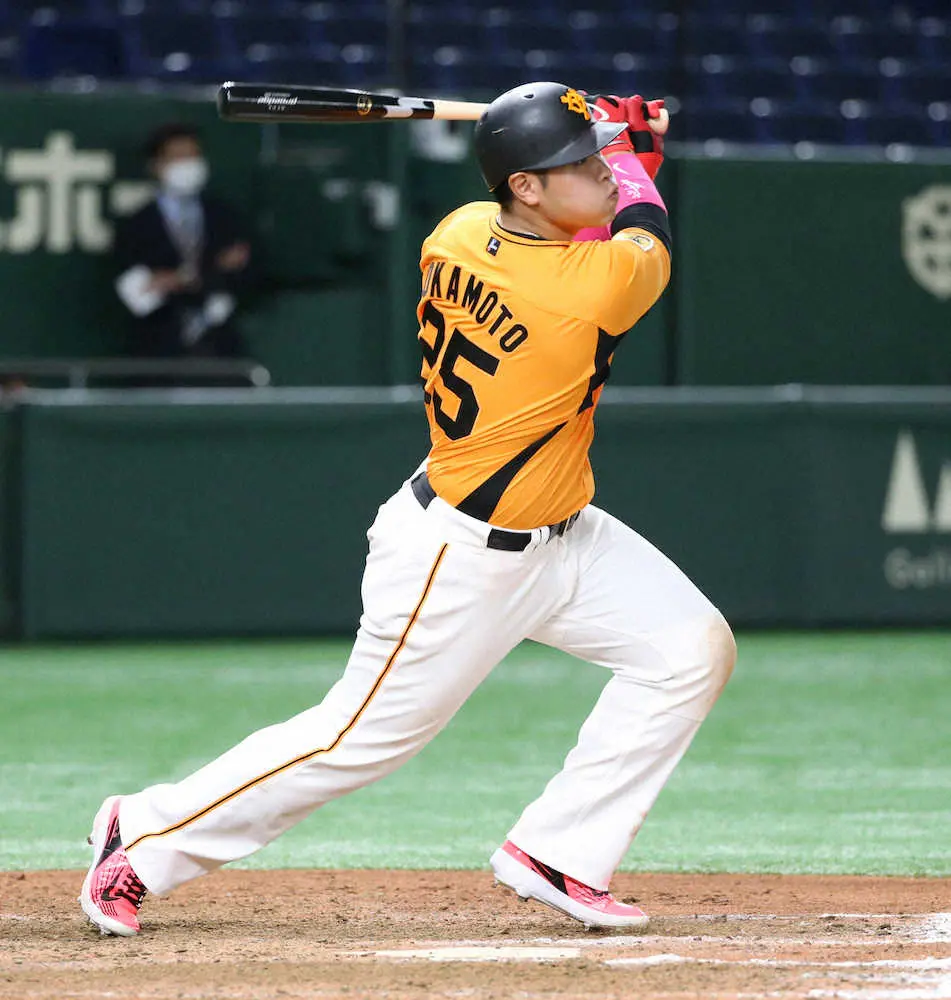 普段の赤から、母の日仕様でピンクのリストバンドを着用して挑んだ。ピンクには思い出がある。少年時代。岡本家では黄色のスポンジボールに、色ペンでピンクのマークを付けていた。家の中で選球眼を鍛えるトレーニング。何も塗っていない球はフルスイングし、ピンクで塗った球は見逃す。中学時代には「ボールの縫い目が見える」とまで語った。丈夫な体だけではなく、強い目を両親がつくってくれた。