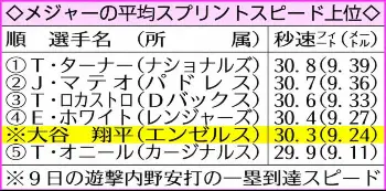 「スタットキャスト」によれば、この走塁が今季メジャー5位相当の秒速30・3フィート(約9・24メートル)を計測。大リーグ公式サイトのサラ・ラングス記者はツイッターで「秒速30フィート(約9・14メートル)がエリート(メジャートップレベル)の境界線。まさしくエリートだ」と興奮気味に投稿した。3回は四球を選び、その後にウォルシュの適時打で逆転の生還も果たすなど、バウアーからの勝利に貢献した。