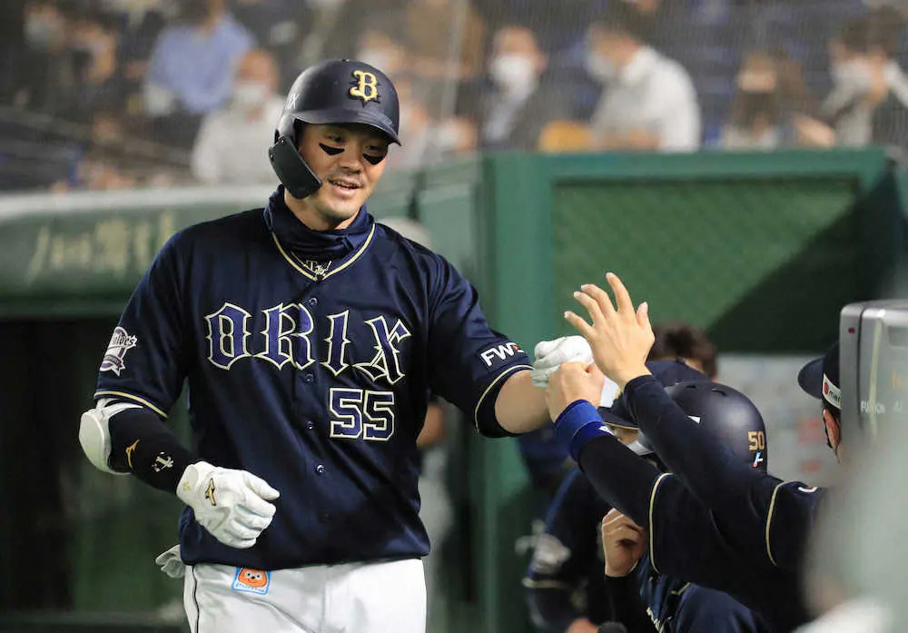 <日・オ(8)>8回無死、左越えソロ本塁打を放ったオリックスのT-岡田(左)はチームメートに出迎えられる(撮影・尾崎 有希)