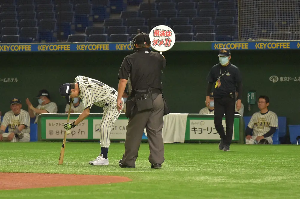 代打を告げられた川藤幸三が口にふくんだビールをバットにふきかけようとすると、審判が「飛沫はダメ!!」