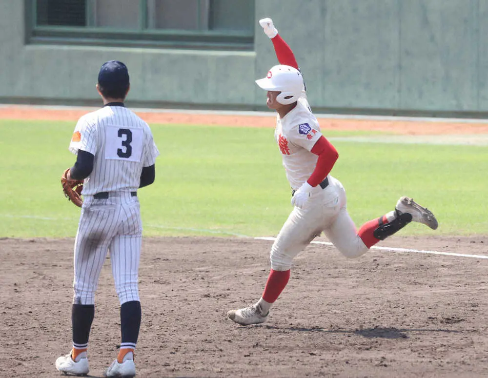 <滋賀学園・智弁>5回2死二塁、2点本塁打を放ちガッツポーズでダイヤモンドを回る智弁・前川(撮影・後藤正志)