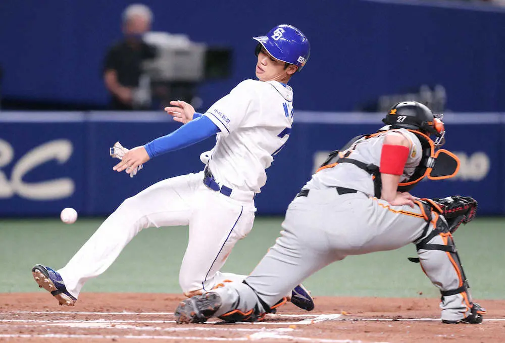 <中・巨(11)>2回2死二塁、福谷の中前適時打で、二塁走者・根尾は本塁に滑り込み生還する(捕手・炭谷)(撮影・椎名 航)