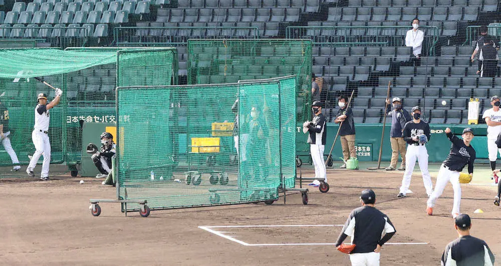 阪神の試合前練習中にグラウンド入りした「令和の怪物」は登板2日前のため、チームの全体ウォームアップとは別メニュー調整。佐々木朗は三塁ベンチ前で、ときおり高校野球中継でも有名なオーロラビジョンに目をやりながら入念にストレッチ。阪神の怪物ルーキー・佐藤輝の打撃練習とほぼ同時に三塁コーチボックス付近でブルペン捕手を相手にキャッチボールを開始した。