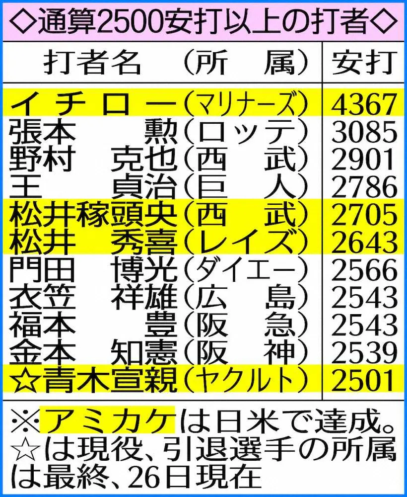 日米通算2500安打以上 Photo by スポニチ ヤクルト・青木 スーパームーンの夜に輝く金字塔「3000本は目指したい」… ギャラリーで見る この記事のフォト 2021年05月27日の画像一覧 もっと見る 2021年05月27日の画像をもっと見る