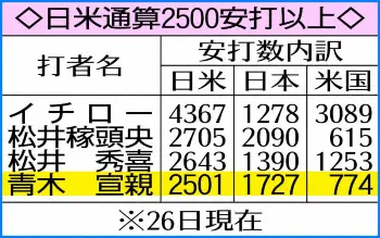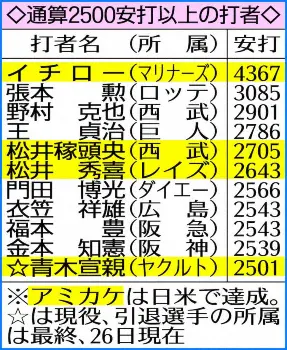 《イチに次ぐスピード到達》青木(ヤ)が26日日本ハム戦の初回に右安打を放ち日米通算2500安打(日本1726、米国774)を達成した。初安打は04年10月6日阪神戦で安藤から。日本人の日米通算2500安打以上はイチローの4367本を筆頭に4人目になるが各選手の2500安打到達ペースを見ると(試合数は日米合計)