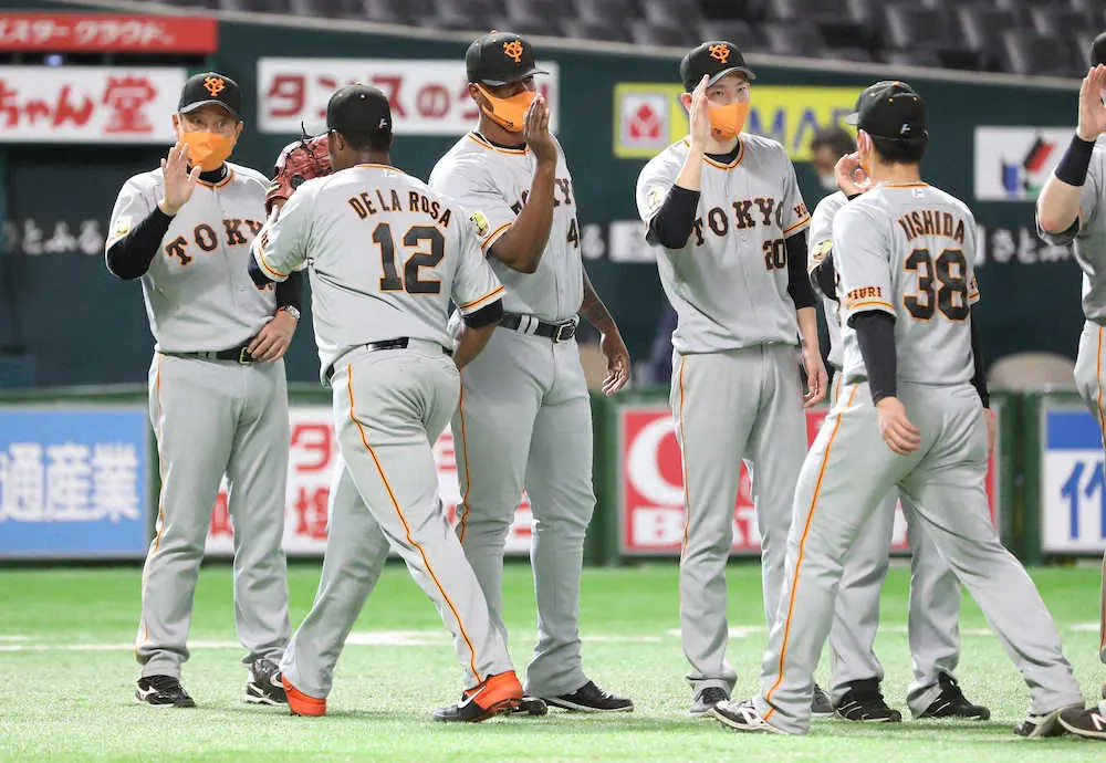 <ソ・巨>勝利を喜ぶ原監督(左)、戸郷(左から4人目)ら巨人ナイン(撮影・岡田 丈靖)