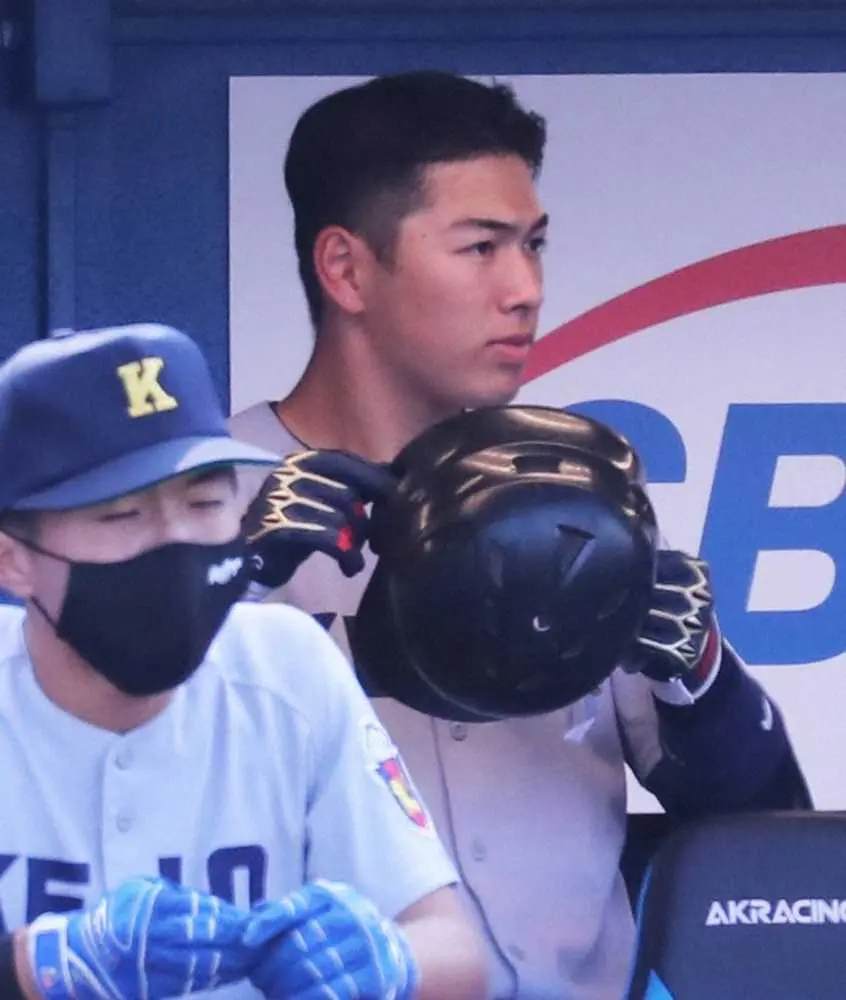 <東京六大学野球新人戦 慶大・早大>バッティンググローブを着けヘルメットを手に出番を待つ慶大・清原(撮影・村上 大輔)
