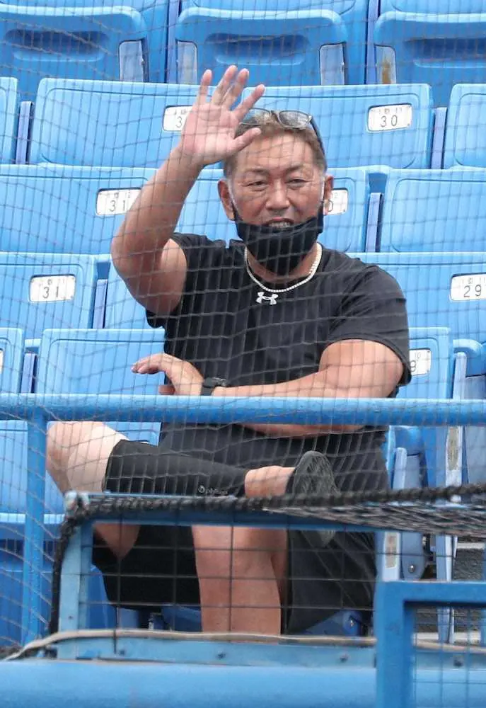 <東京六大学野球新人戦 慶大・早大>慶大ベンチに手を振る清原氏(撮影・村上 大輔)