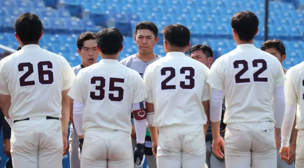 <東京六大学野球新人戦 慶大・早大>試合を終えあいさつのため整列する慶大・清原(中央奥)=撮影・村上 大輔