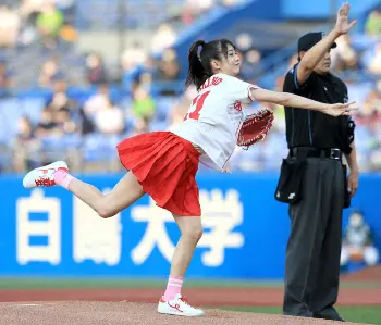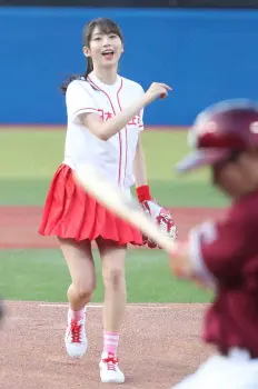ユニホームにミニスカート姿でマウンドへ。打席の楽天・小深田の方へ逸れるも見事なノーバウンド投球を披露した。通算5度目の大役を終え、「ノーバウンドでバッターボックスまで届いたので80点です。次はストライクを目指したいです。始球式で全球場を制覇したいです」と笑顔だった。