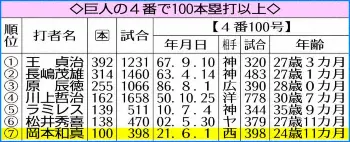 第89代の4番に座り398試合目。24歳11カ月での到達は長嶋茂雄の27歳1カ月を抜き最年少だ。王貞治、原辰徳、松井秀喜らそうそうたる顔触れの仲間入りに、原監督は「俺なんか比じゃない。はるかに素晴らしい4番。王さん、長嶋さんの記録を抜く可能性をうんと持っている人」と絶賛する。